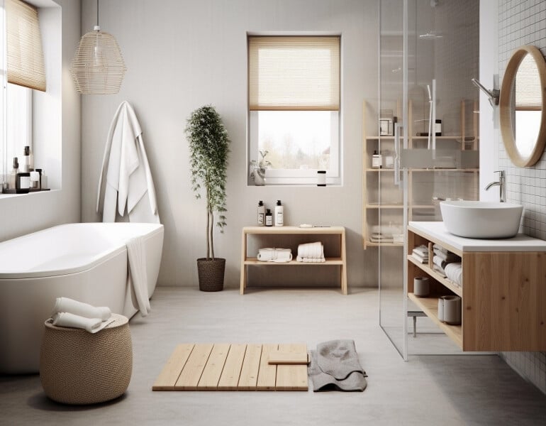 Toujours très tendance, le style scandinave incarne la simplicité et l’élégance fonctionnelle. Dominé par des couleurs claires comme le blanc, le gris et les tons pastel, il privilégie les matériaux naturels, et notamment le bois pour créer une ambiance chaleureuse et apaisante. Les meubles sont souvent suspendus pour maximiser l’espace, et les accessoires sont réduits au minimum. La salle de bains au style scandinave est lumineuse et accueillante, parfaite pour se détendre et se ressourcer.