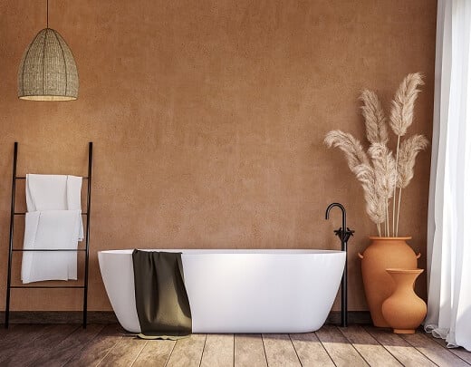 On ajoute des bouquets de fleurs séchées, quelques bougies et du linge de toilette en matière organique pour la touche finale. Il ne vous reste plus qu’à profiter de l’ambiance chaleureuse de votre salle de bains !