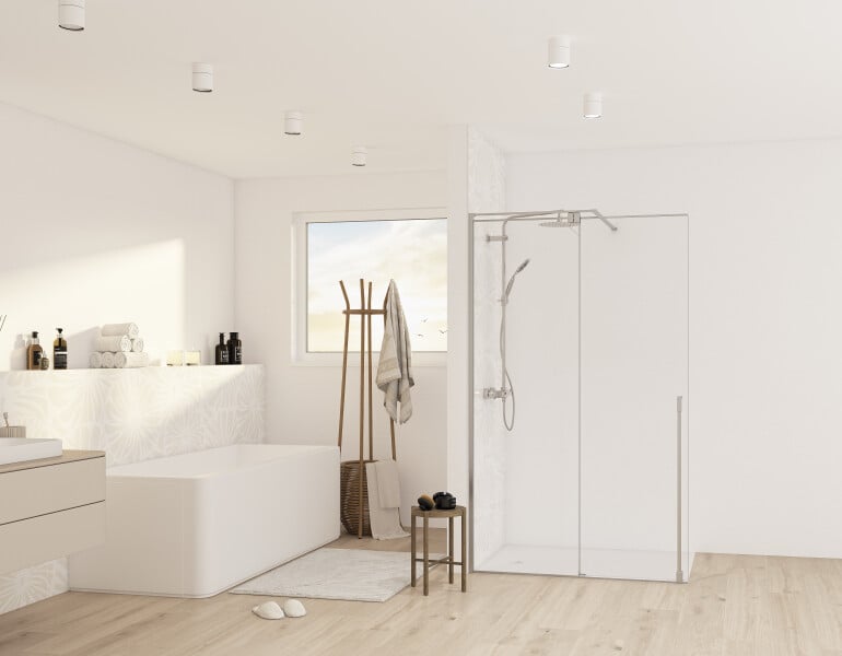 Pour une salle de bain blanche tendance, le receveur de douche extra-plat Kineline est un choix parfait. Son effet granit texturé offre une continuité harmonieuse avec le sol. Associez-le à une paroi de douche minimaliste pour mettre en valeur l’espace.