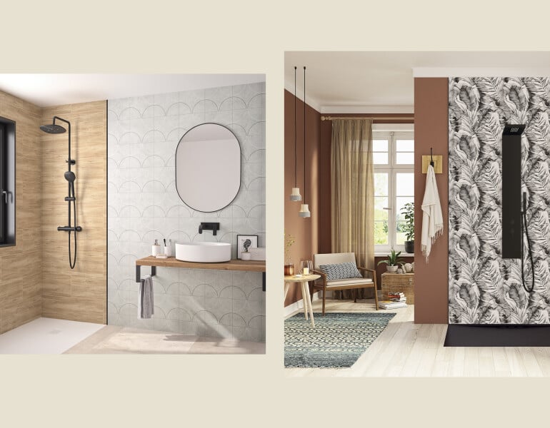 Autre option : les panneaux d’habillage muraux. Ils présentent de nombreux avantages, dont celui de se fixer facilement par-dessus un revêtement mural existant : carrelage, peinture ou mur crépi par exemple. Un point fort non-négligeable lorsque l’on veut rénover sa salle de bains à moindres frais et sans gros travaux ! Étanches et hydrofuges, ils résistent aussi aux tâches, aux UV, aux chocs et aux rayures, et sont très faciles à entretenir. Enfin, ils se déclinent en une vaste palette de finitions, de décors et de couleurs, pour personnaliser votre décoration.