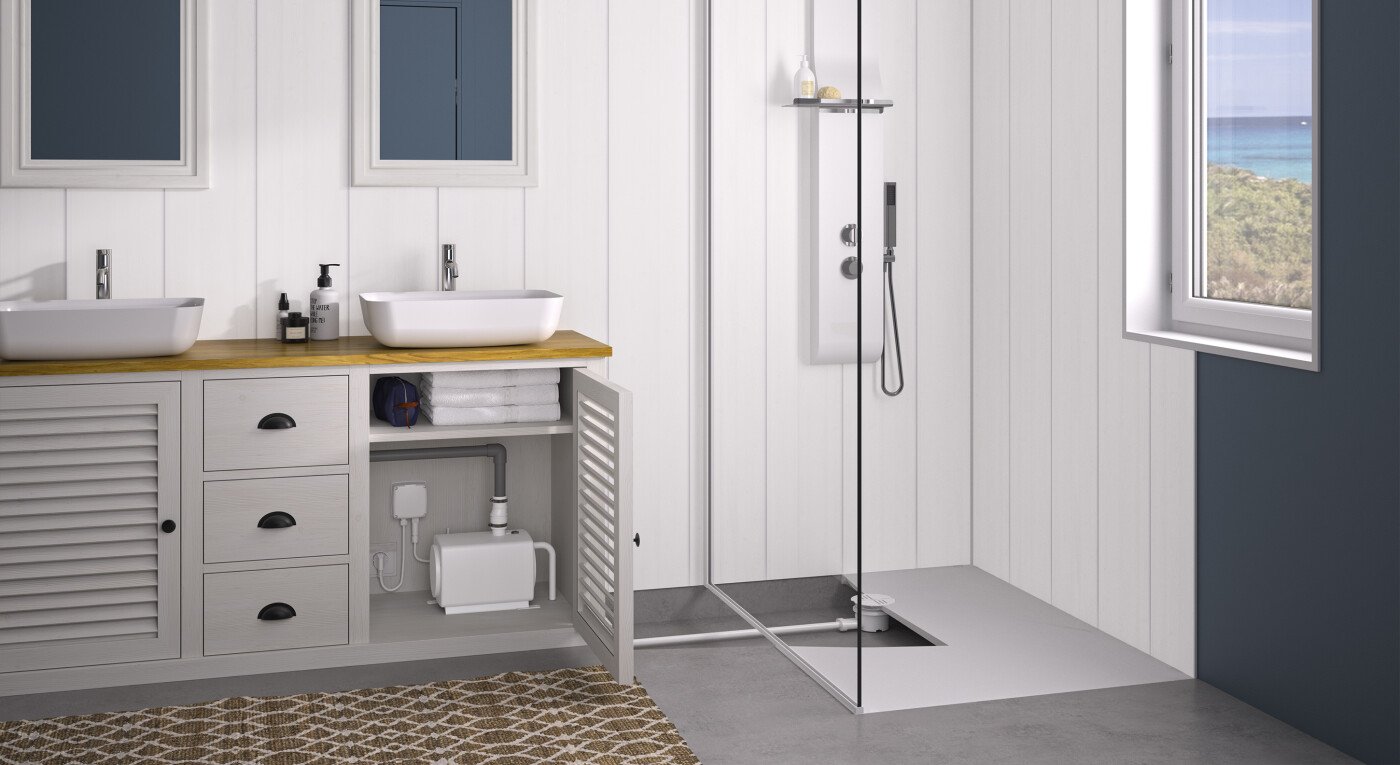 Pompe de relevage aspirante avec bonde, permettant d’installer de plain-pied un receveur Kinedo