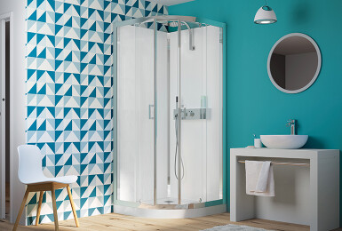 • La cabine de douche quart de cercle : Idéale pour les petits espaces, la cabine de douche d’angle arrondie ne prend pas trop de place dans la pièce. Elle est généralement déclinée en 70, 80 et 90 cm de côté.