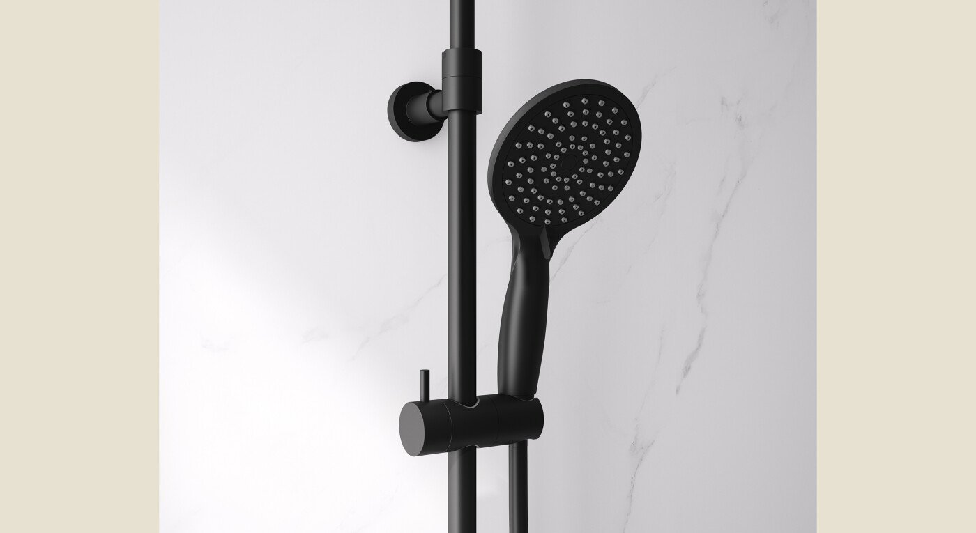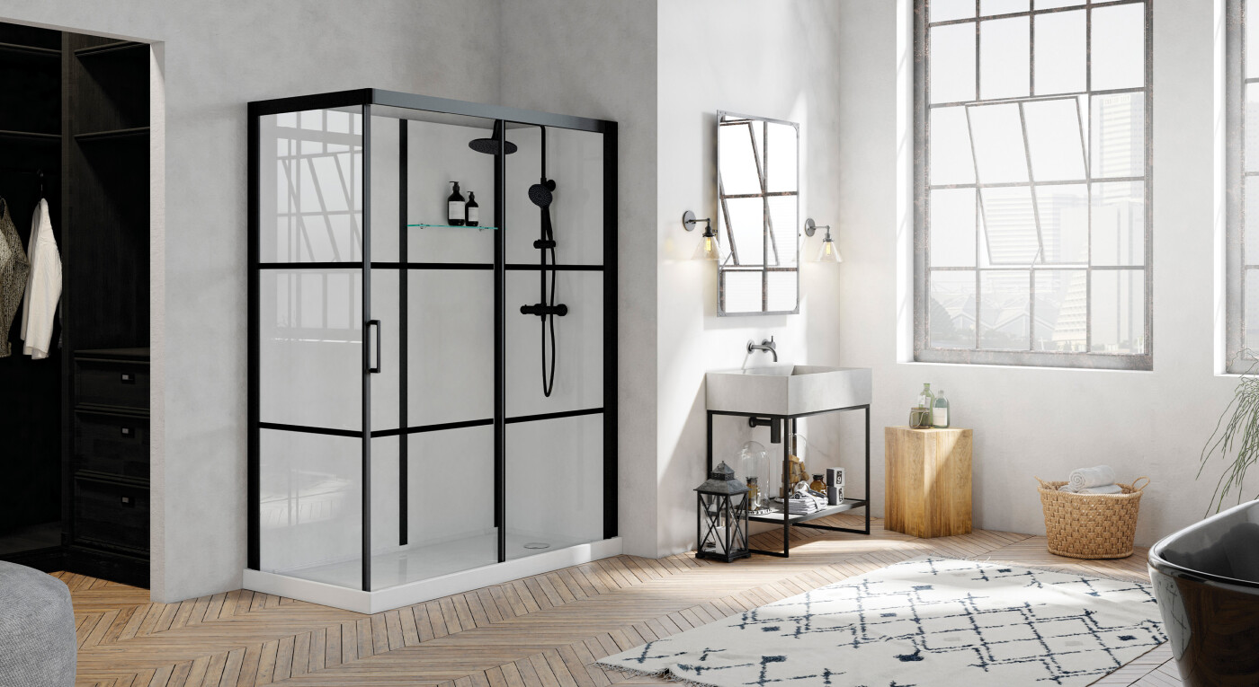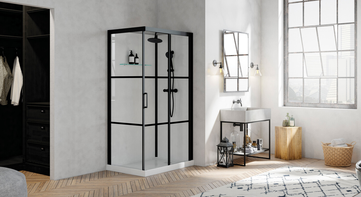 - 2 finitions : Standard avec combiné de douche chromé et profilés alu laqués gris clair, ou Factory avec combiné de douche noir et profilés alu noir grainé.