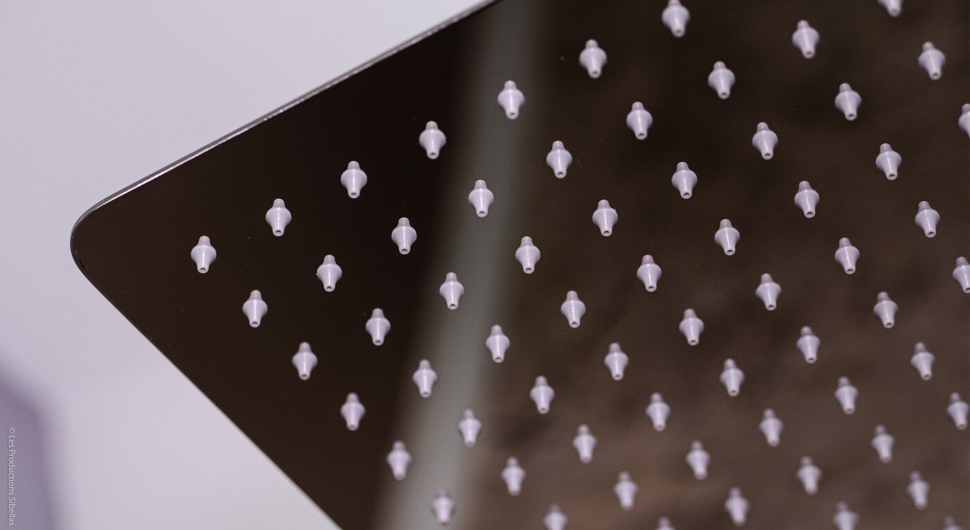 - douche pluie ultra plate, pour une douche façon pluie tropicale. Ses picots en silicone anticalcaires facilitent l’entretien de cette douche pluie.