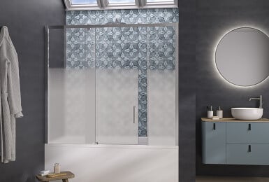 - Le pare-baignoire intégral : Ce type de pare-bain permet de fermer complètement la baignoire pour créer un espace de douche parfaitement étanche. L’accès se fait par des portes pivotantes. Cette solution est parfaite pour que le bain des enfants ne transforme pas la salle de bain en pataugeoire !
