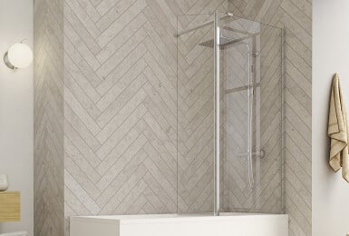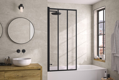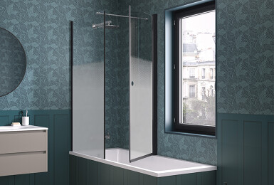 - Le pare-baignoire pivotant : Il se compose de 1, 2 ou plusieurs volets, qui pivotent à 180° pour libérer l’accès à la baignoire. Généralement dans le prolongement d’une paroi fixe, les volets rabattables se replient contre celle-ci, offrant une large ouverture. Ils peuvent également être directement fixés contre le mur et se replier contre la paroi intérieure de la douche pour plus de discrétion et une optimisation de l’espace. Selon le nombre de volets, ce modèle assure une protection étendue contre les projections d’eau.