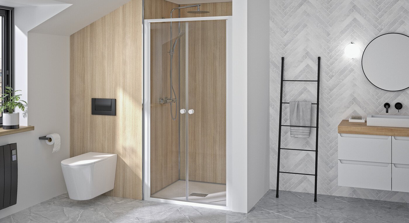 Supra 2P est une paroi de douche avec 2 portes pivotantes, conçue pour une douche en niche.