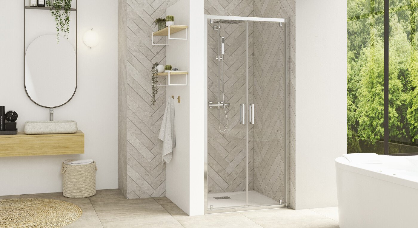 Disponible en 9 largeurs, de 70 à 120 cm, pour une hauteur de 2 mètres, Smart Design 2P avec seuil existe en 2 couleurs de profilés (blanc ou chromé) et 2 finitions de verre (transparent ou sérigraphié à bandes verticales). Pour encore plus d’élégance, les poignées et les pivots sont assortis aux profilés.