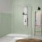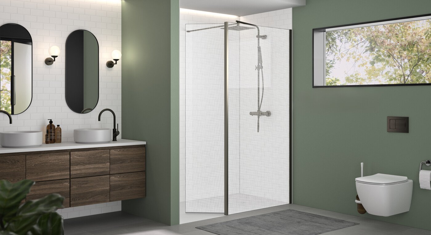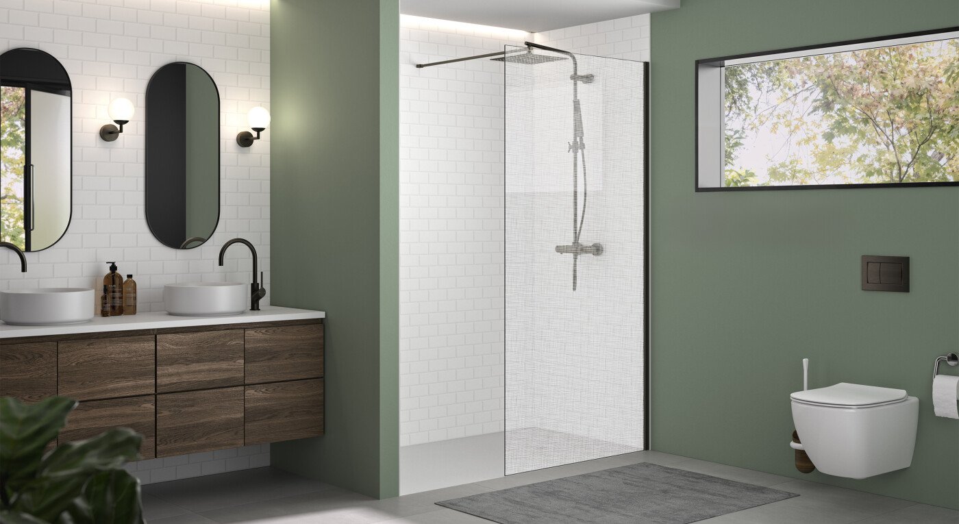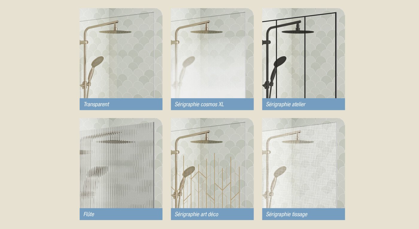 • 6 finitions de verre (selon finition de profilé) : transparent, sérigraphie cosmos XL, sérigraphie atelier, flûte, sérigraphie art déco, sérigraphie tissage. Le verre est traité anticalcaire pour un entretien simplifié au quotidien.