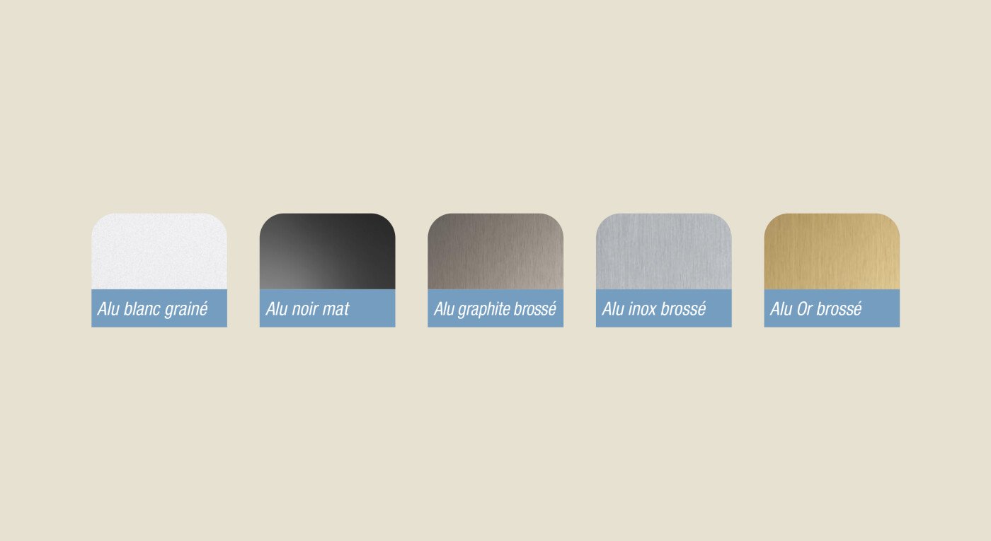 • 5 finitions de profilé (+ barre de renfort) : aluminium blanc grainé, noir mat, inox brossé, graphite brossé ou or brossé.