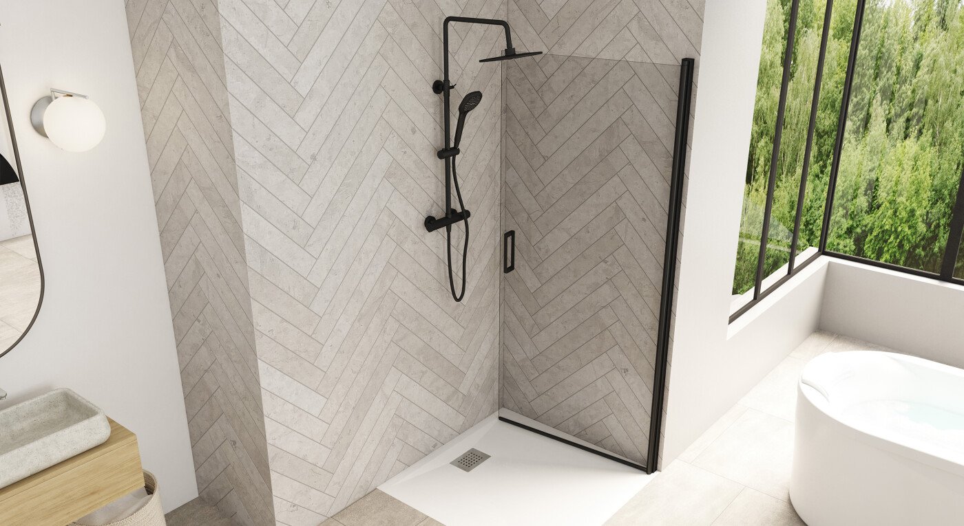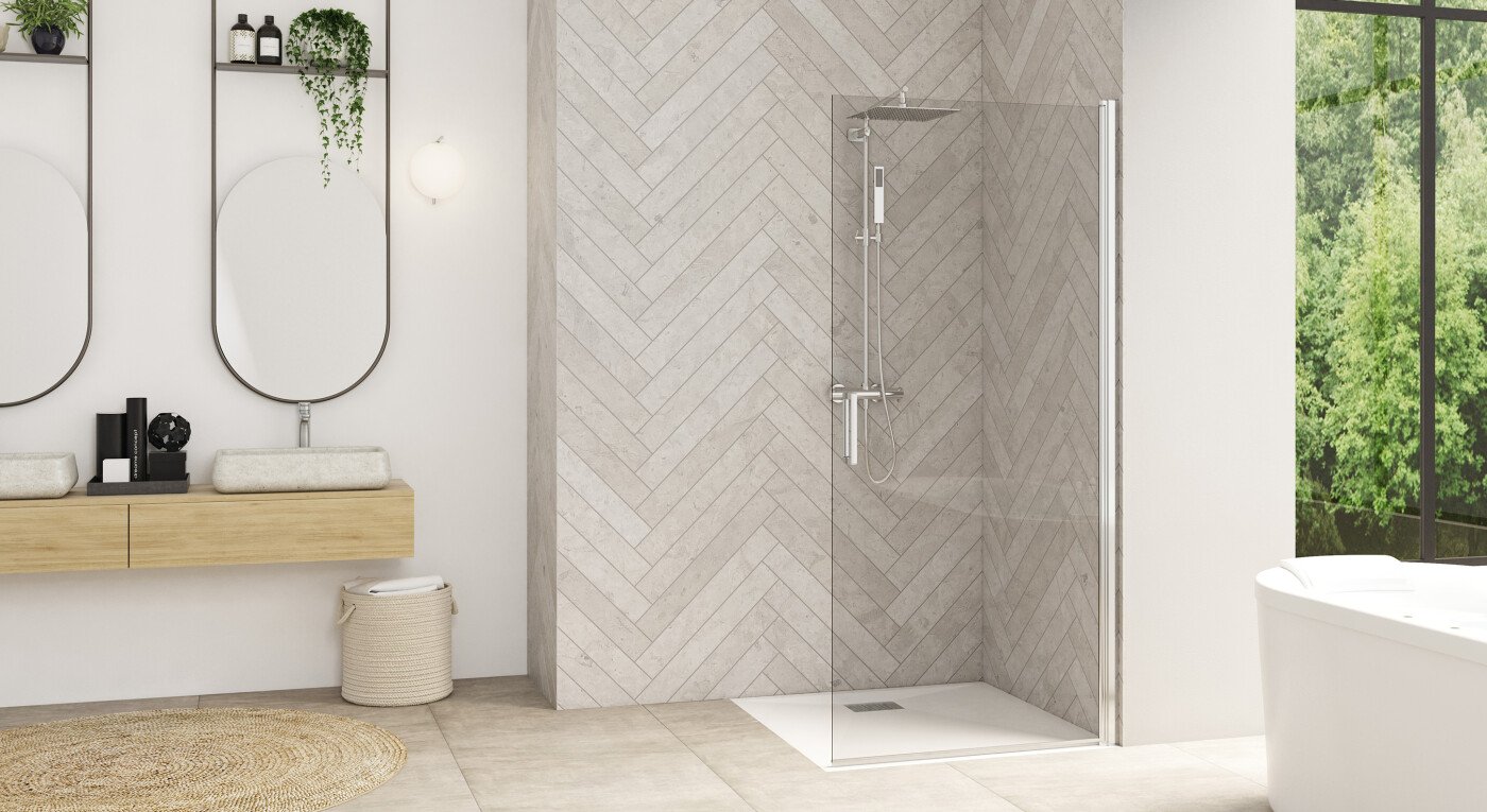 Paroi simple pivotante pour un espace douche ouvert, spécial gain de place