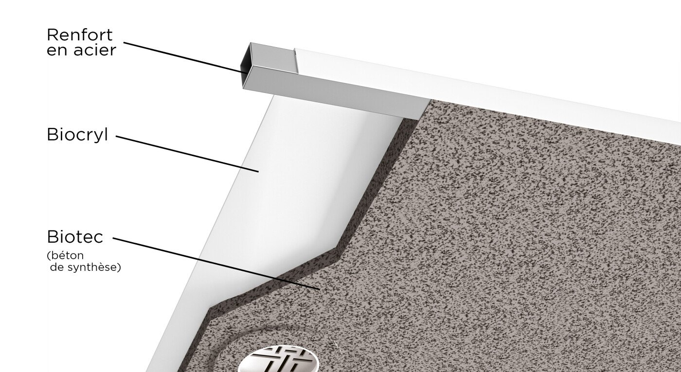 • Biocryl : revêtement en acrylique renforcé par de l’ABS. L’acrylique est un matériau bactériostatique et naturellement non glissant Sa composition permet d’obtenir un matériaux léger, isolant thermique et phonique. Ces receveurs ont une excellente résistance aux chocs et sont très rigides. |